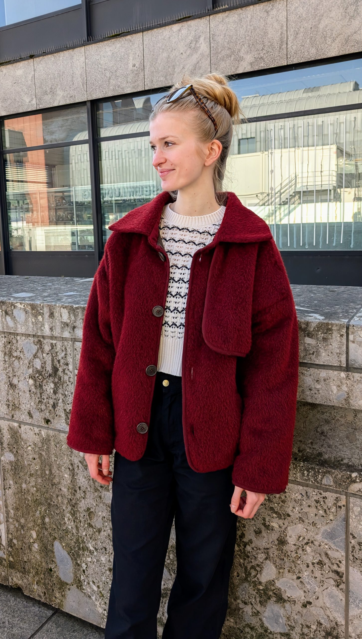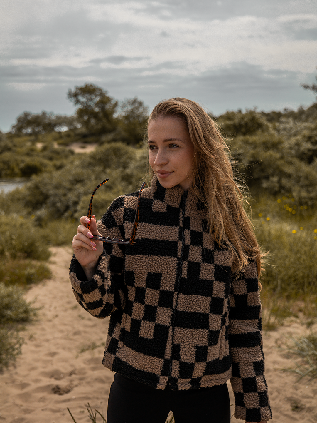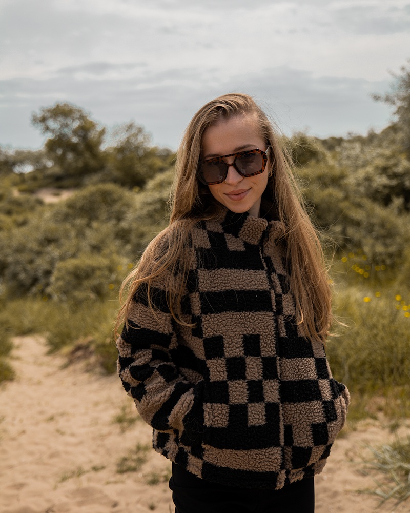 Ihr weicher, flauschiger Stoff macht sie zum perfekten Begleiter an kühlen Tagen, ohne dich zu überhitzen. Genau das Richtige für die Übergangszeit, wenn das Wetter wechselt aber dein Look on point bleiben soll. Besonders ins Auge fallen die geometrischen Muster, die der Jacke ein modernen Touch verleihen.