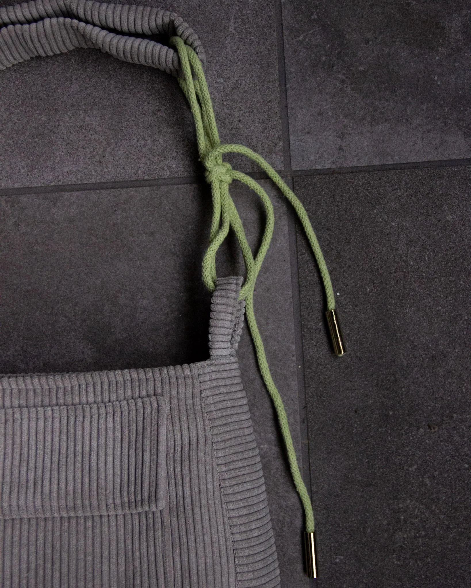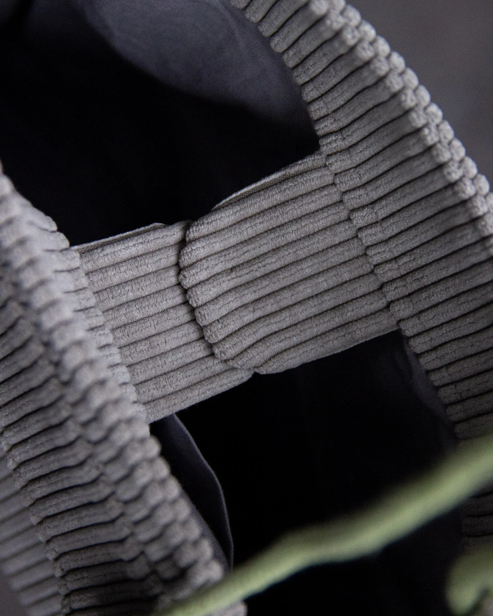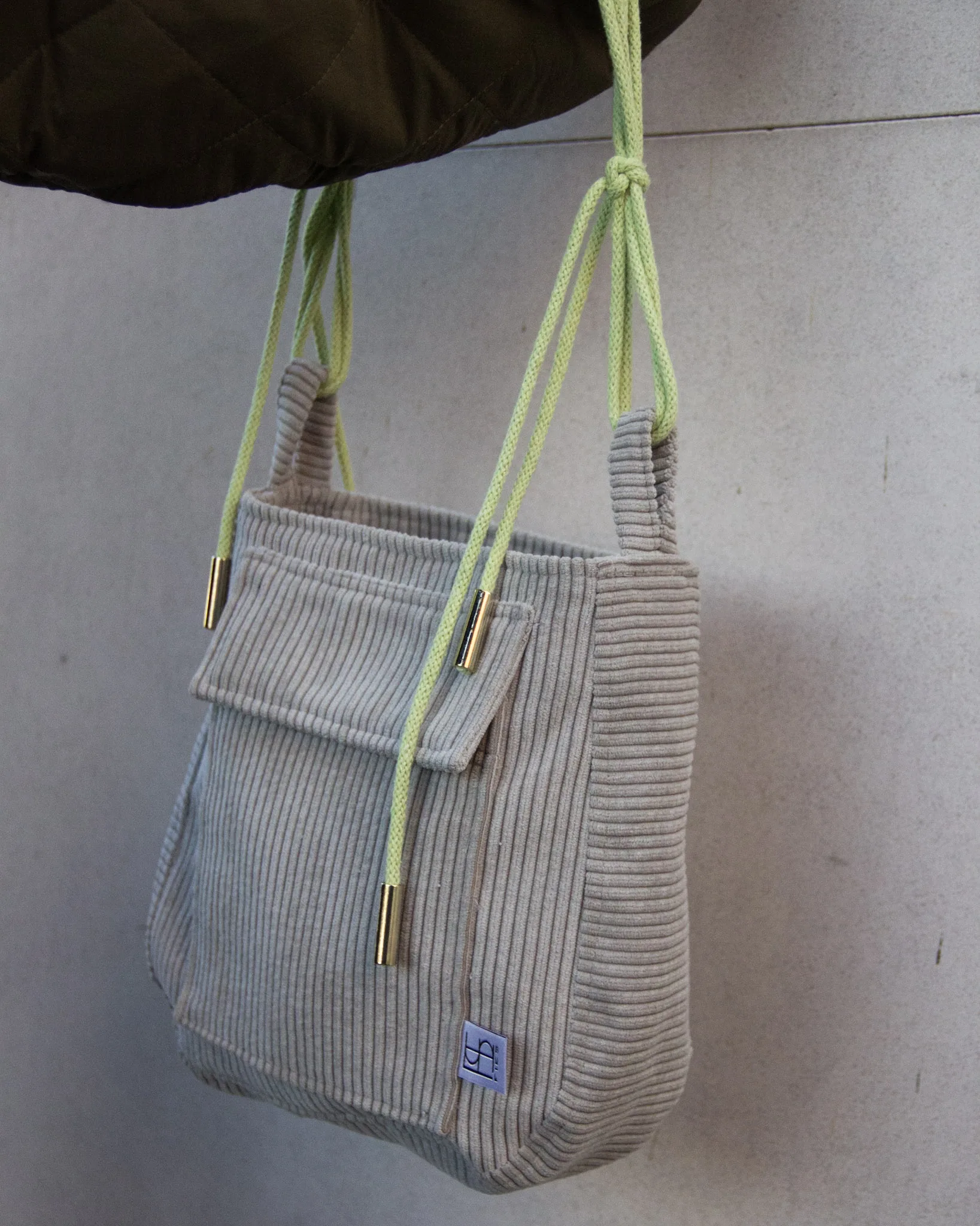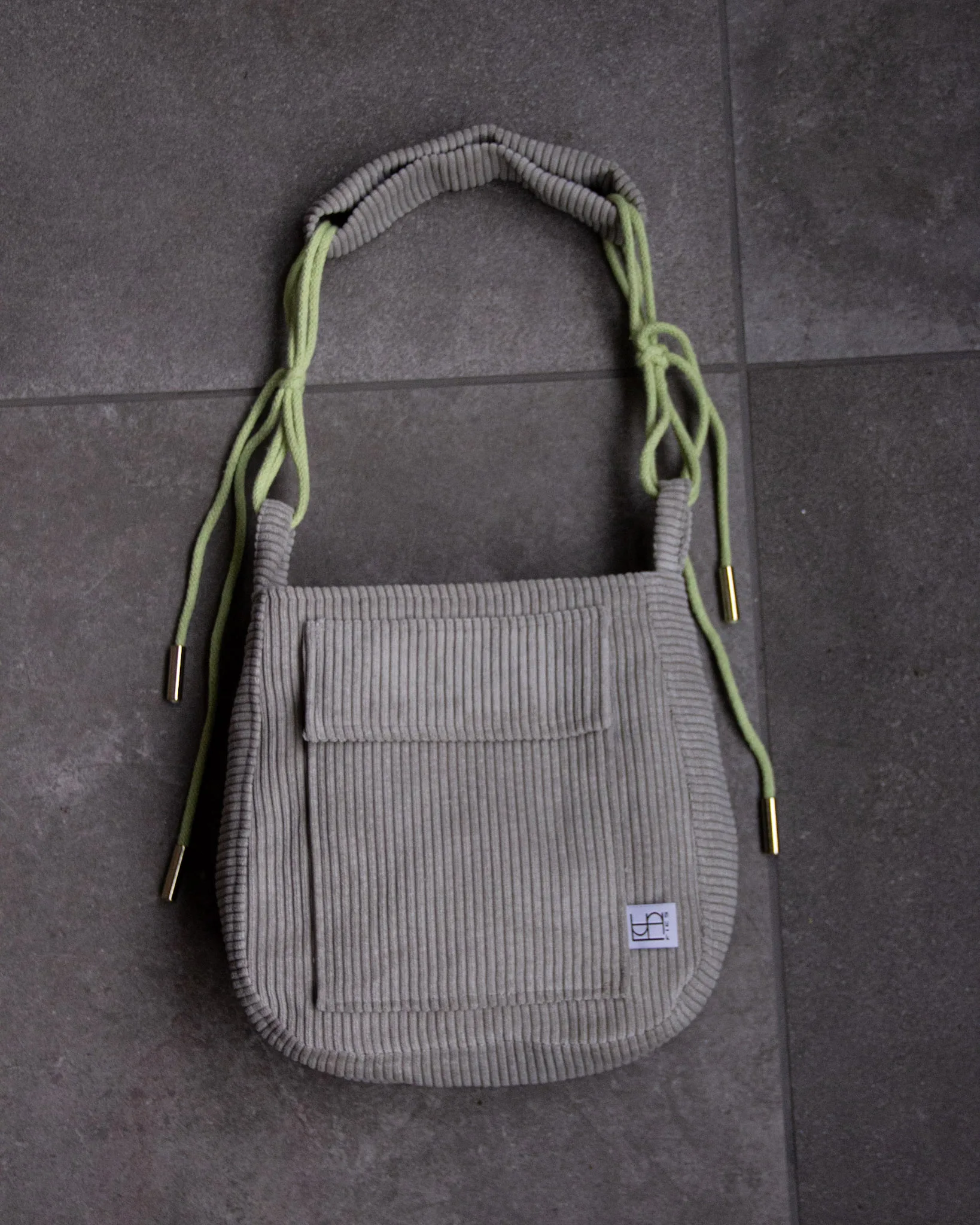 Der hochwertige Cord in einem hellengrau kombiniert mit einer lässigen hellgrünen Kordel verleiht der Tasche einen modernen, auffälligen Look. Ideal für alle, die besondere Taschen lieben mit einem hauch Farbe.