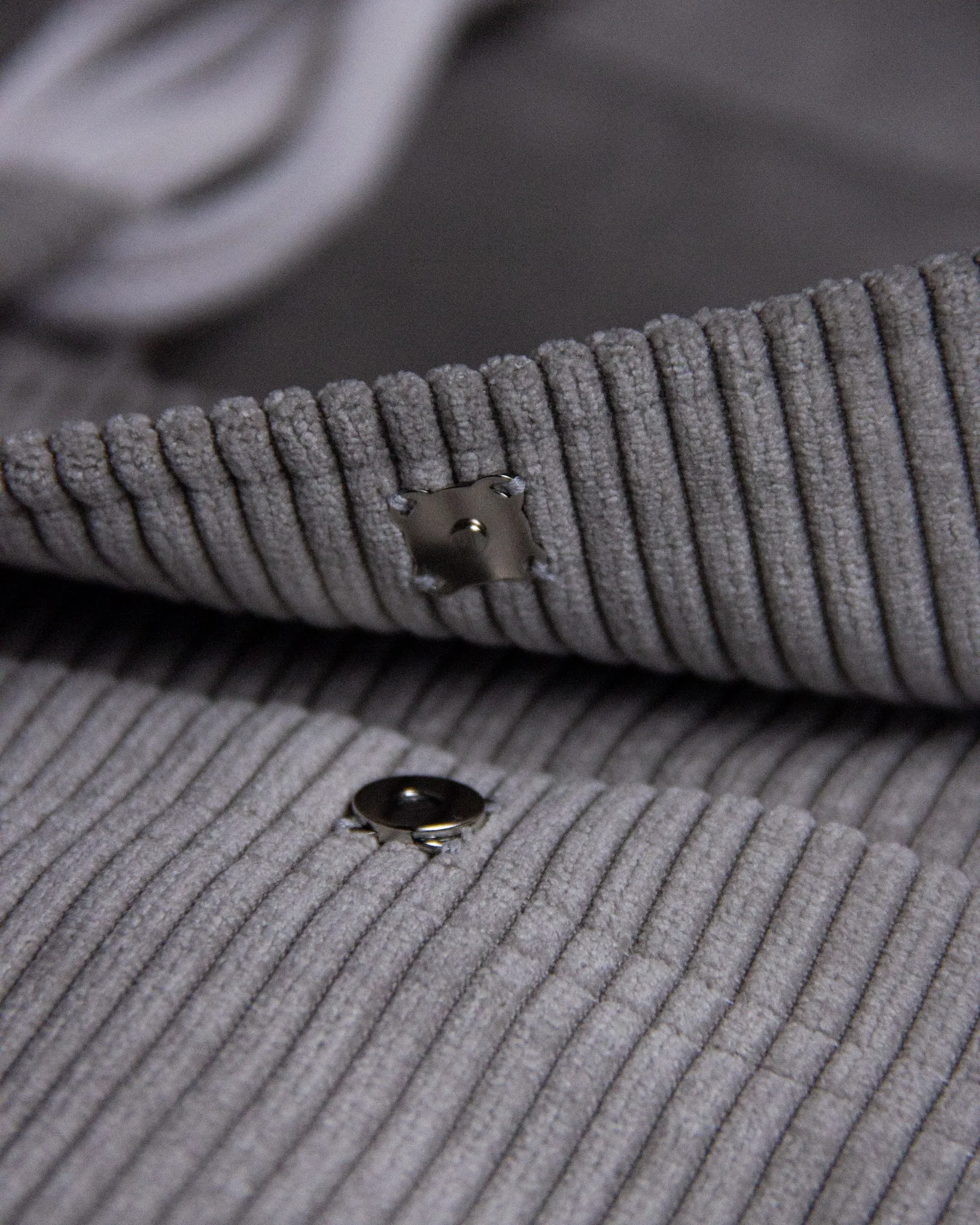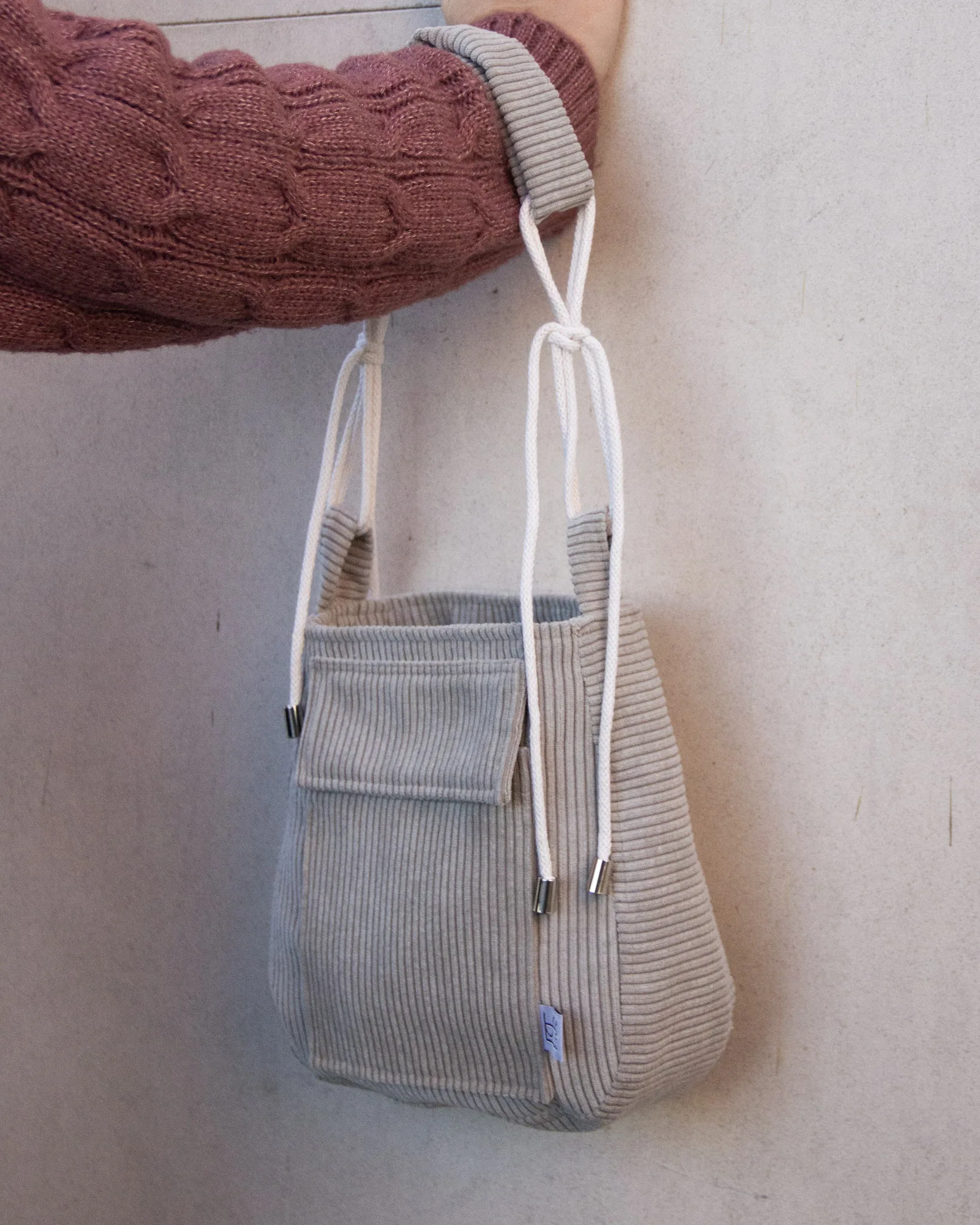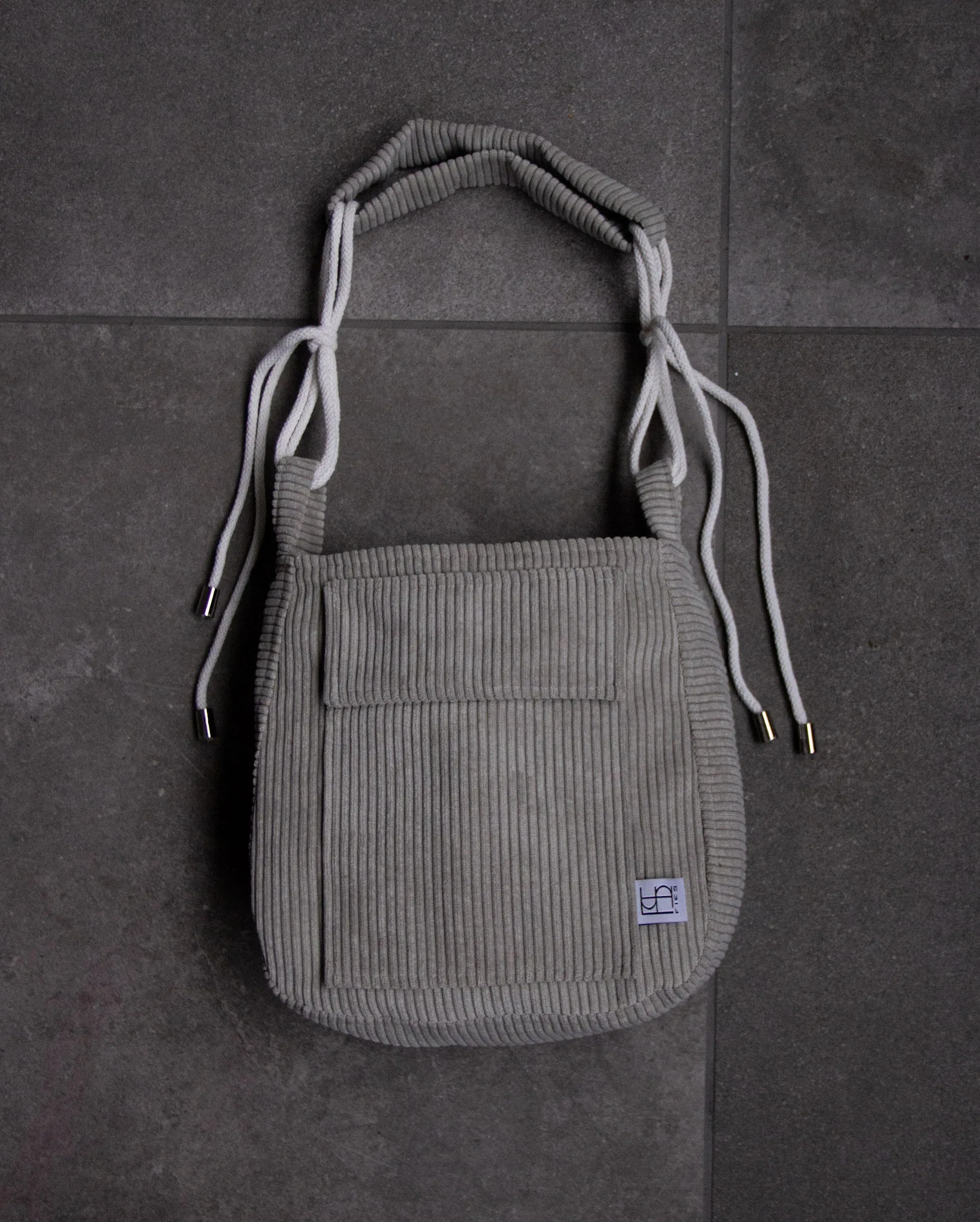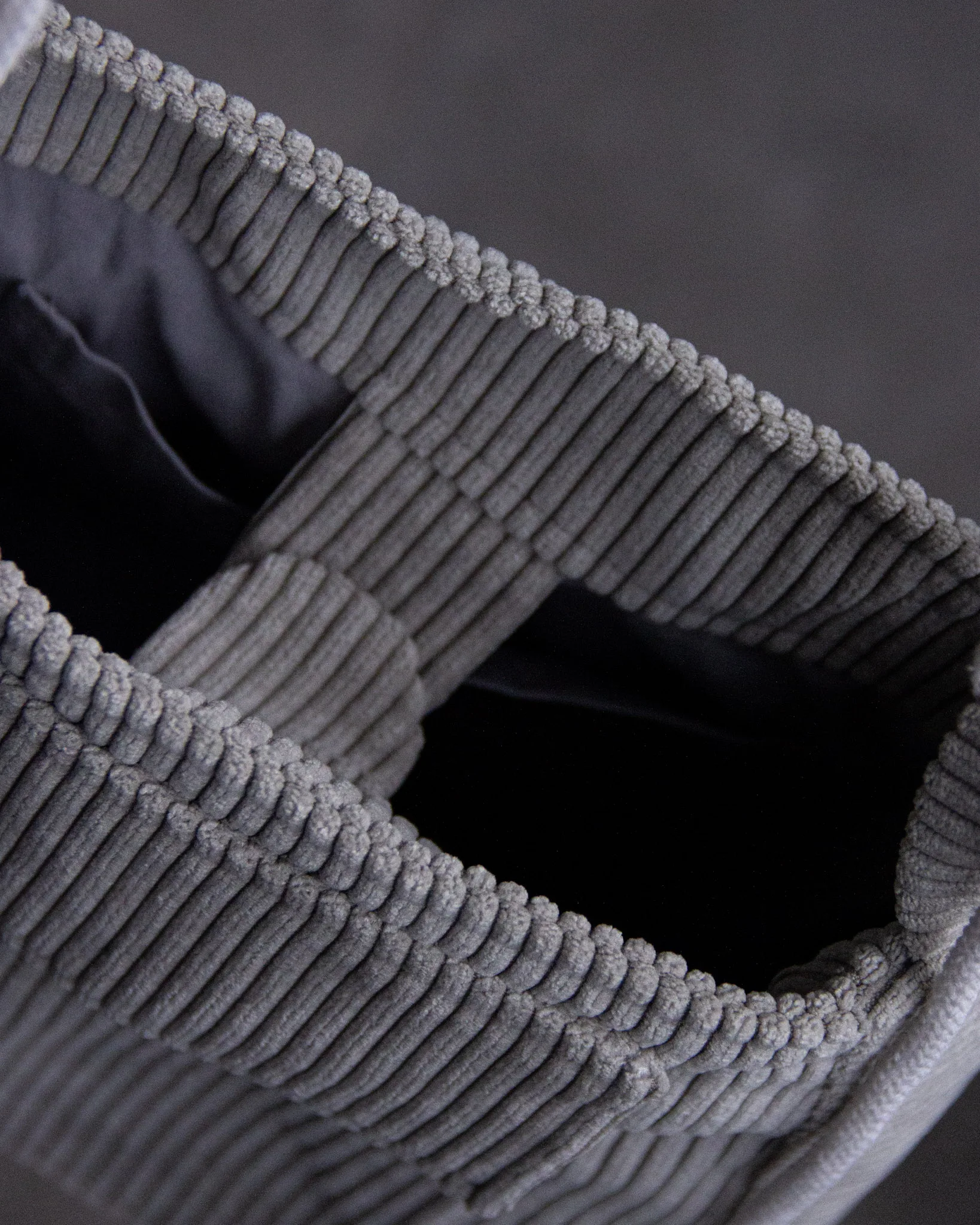 Der hochwertige Cord in einem hellengrau kombination mit einer lässigen Kordel in creme verleiht der Tasche einen coolen, auffälligen Look. Ideal für alle, die besondere Taschen lieben.