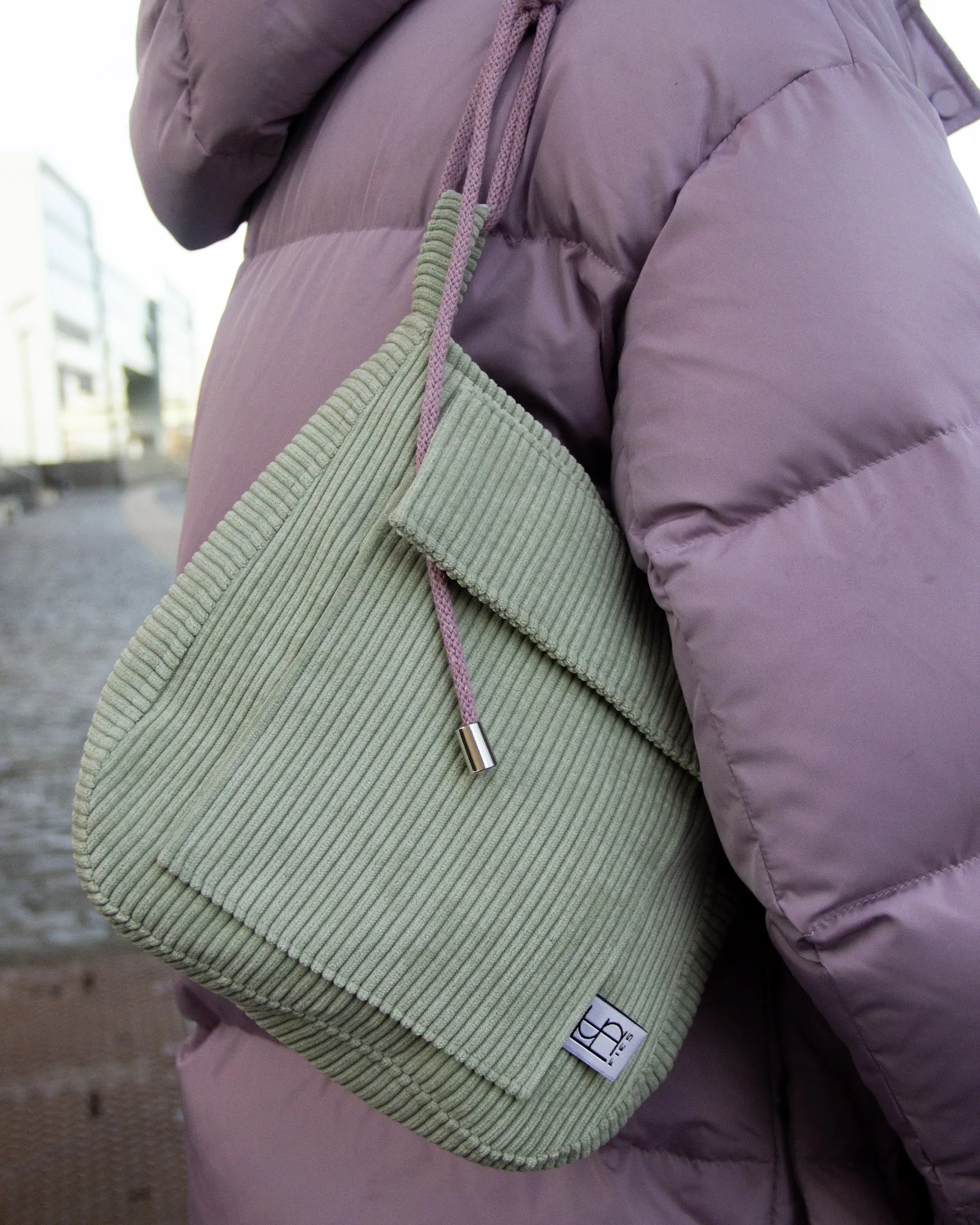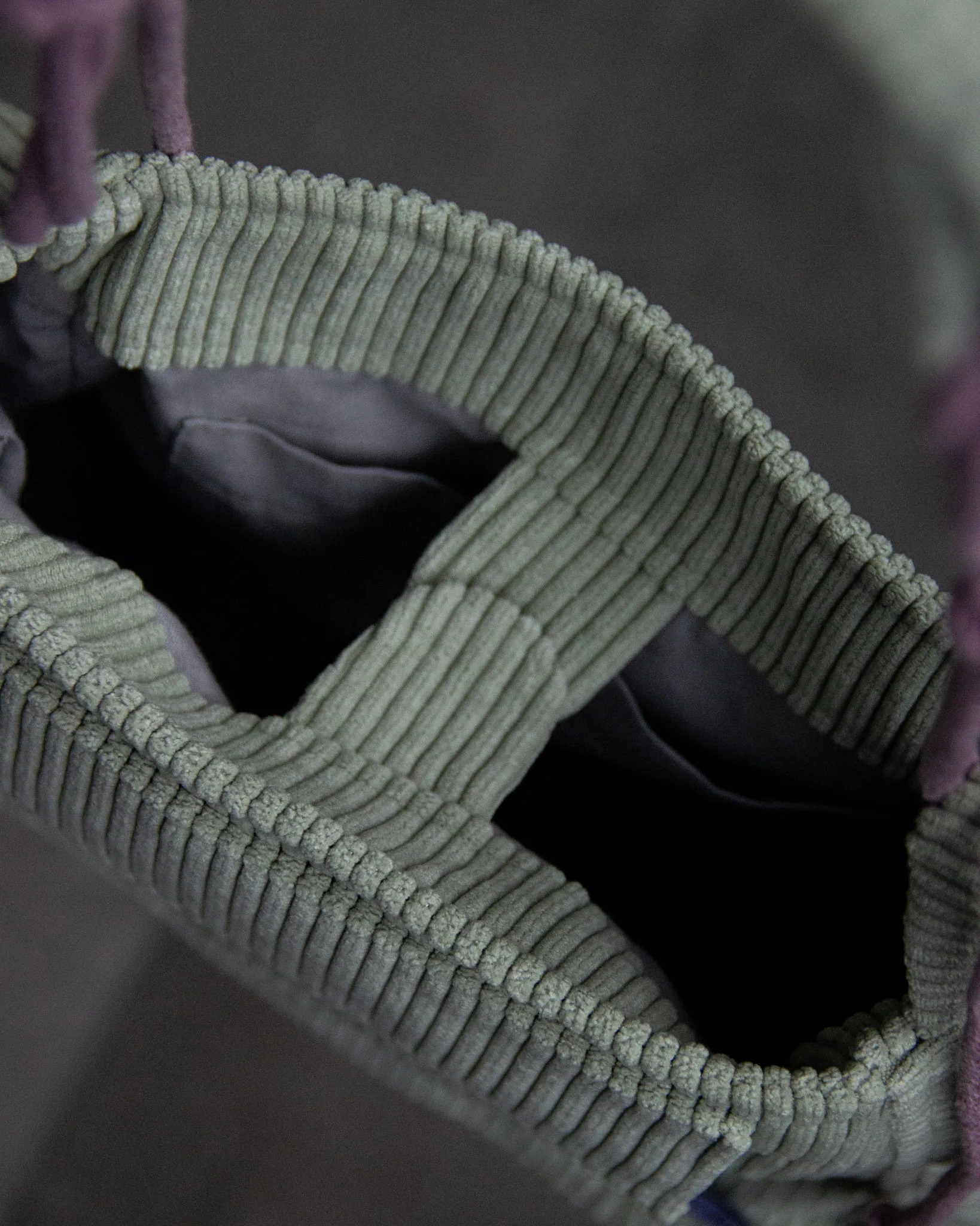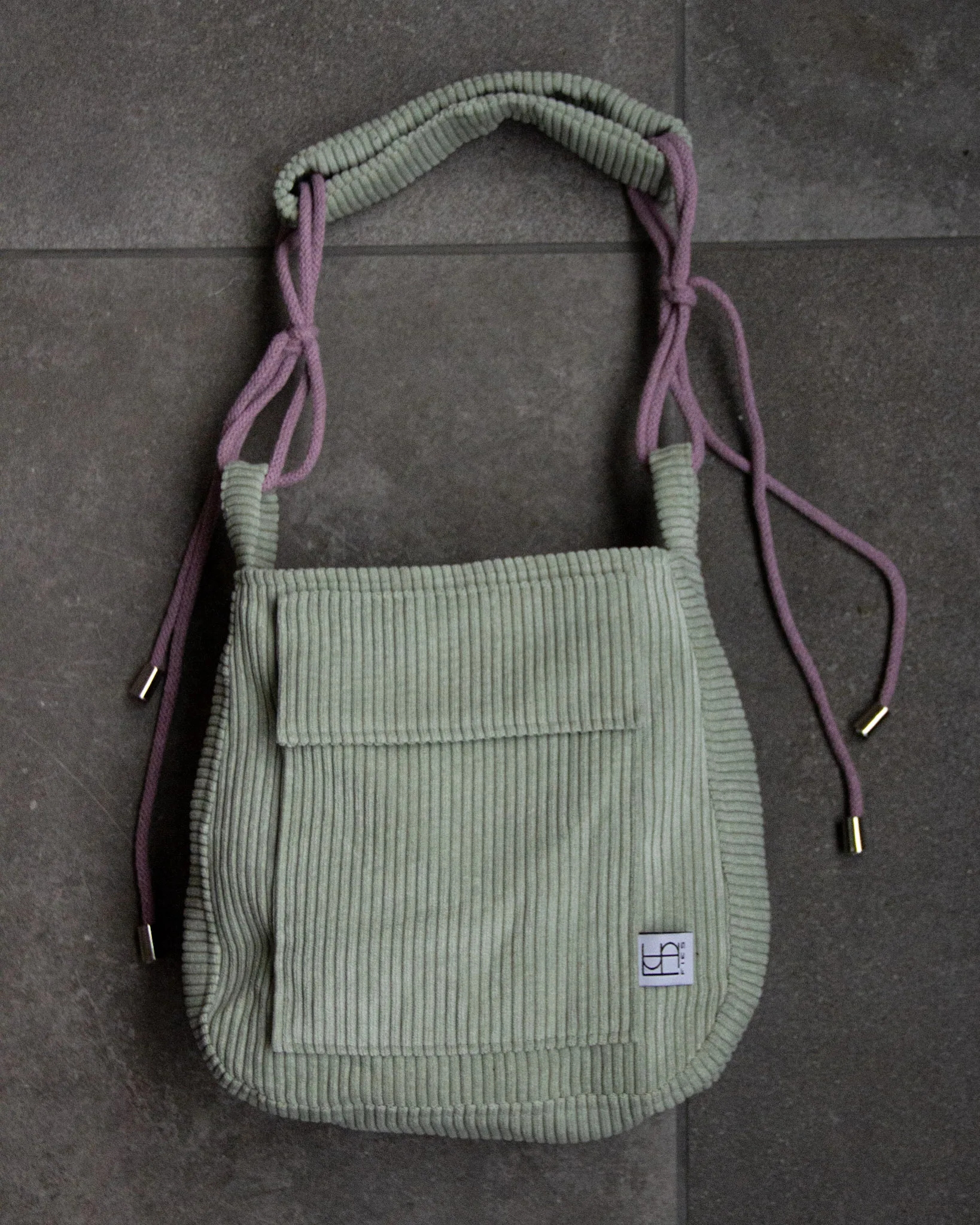Der hochwertige Cord in einem lindgrün kombination mit einer lässigen lilafarbenen Kordel verleiht der Tasche einen coolen, auffälligen Look. Ideal für alle, die besondere Farben lieben.
