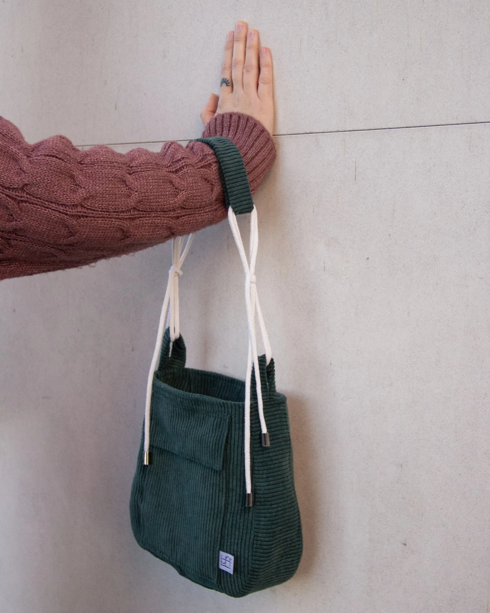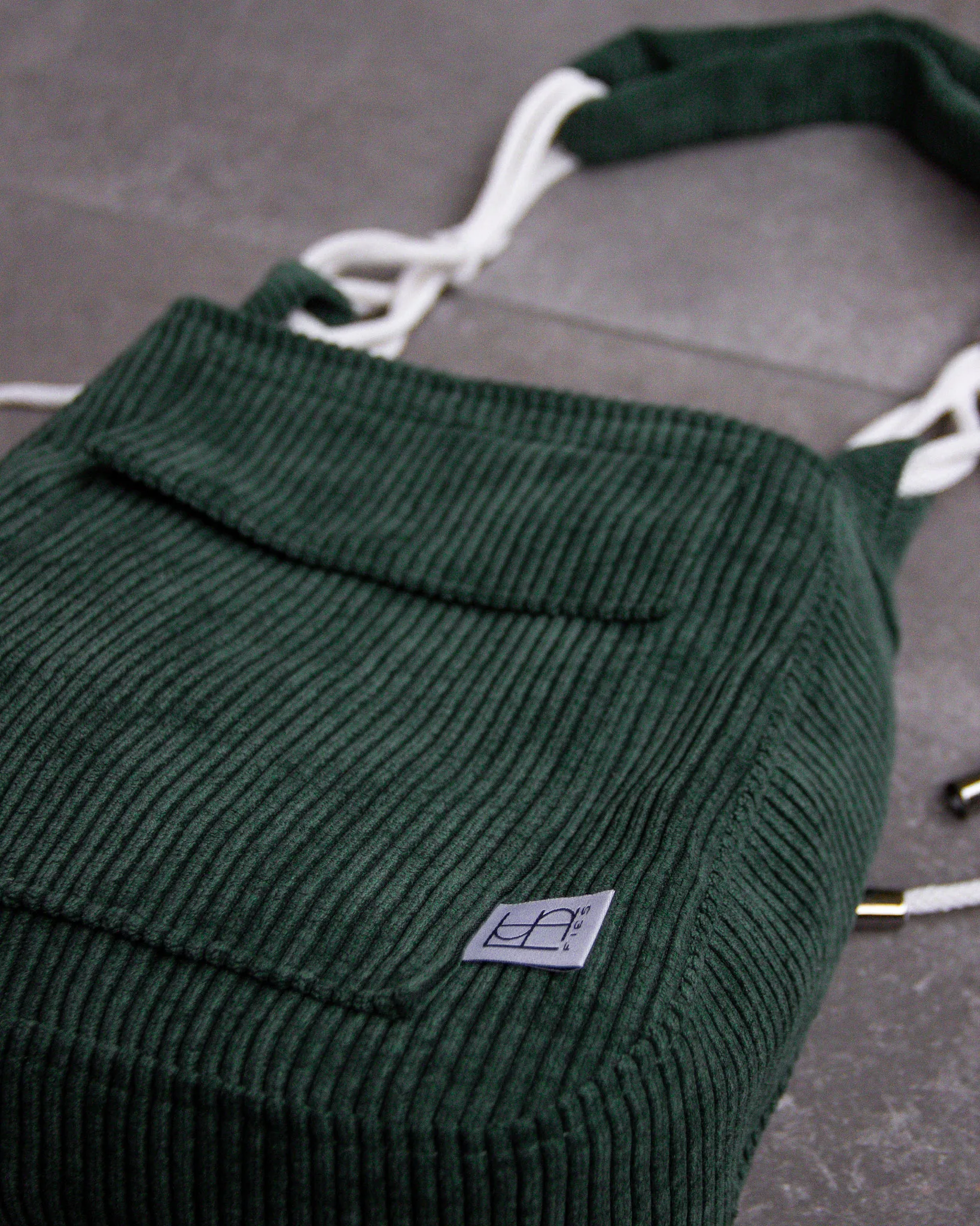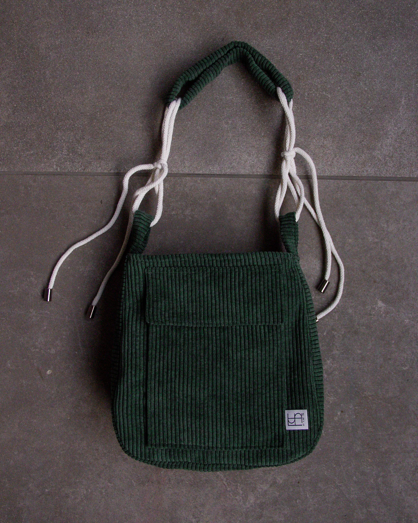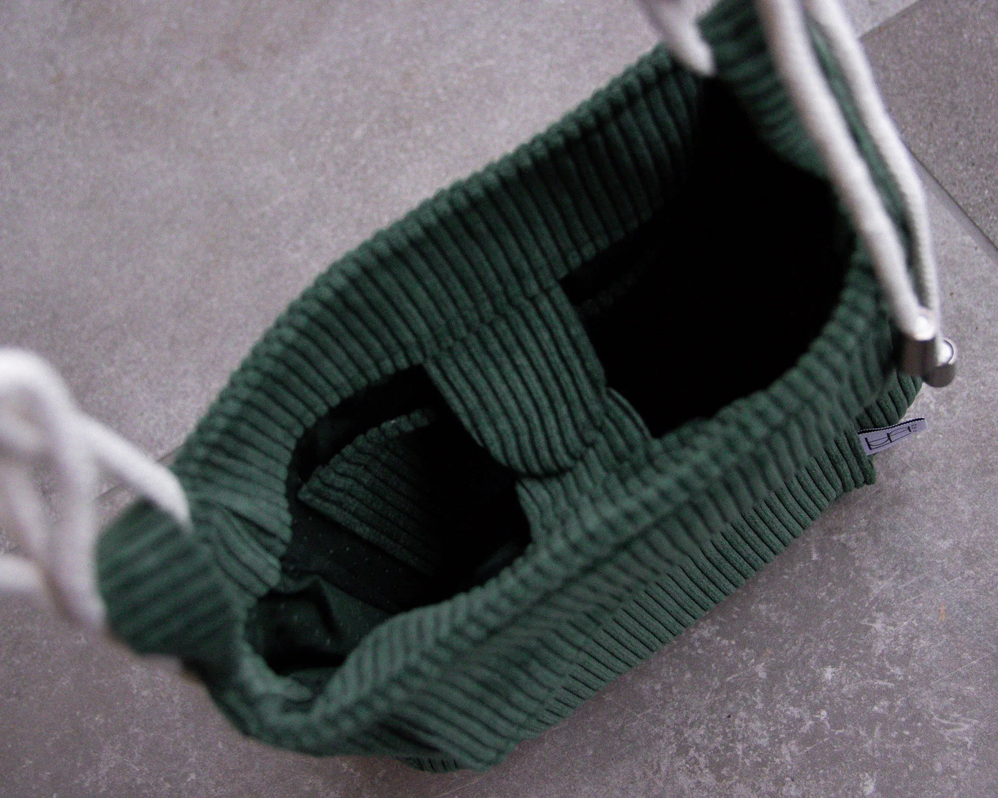 Der hochwertige Cord in waldgrün kombiniert mit einer lässigen creme Kordel verleiht der Tasche einen modernen, auffälligen Look. Ideal für alle, die besondere Taschen lieben.